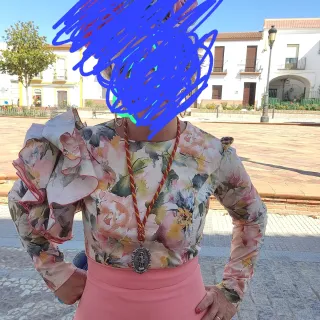 Traje de flamenca con un diseño original y llamativo. Perfecto para ferias y romerías. - Estampado de lunares y círculos en tonos marrones y azules. - Múltiples volantes en la falda para un movimiento espectacular. - Diseño sin mangas. La camiseta obviamente no forma parte del traje. Está hecho a mano. Por lo que no tiene marca. Tiene cordel para ajustarlo en la parte superior. Mis medias son: Cadera 125cm Cintura 90cm Pecho 102cm Altura 179cm Para haceros una idea de la talla. A mí me queda suelto y me lo he probado con la ropa debajo. Así que podría dar algunos centímetros más