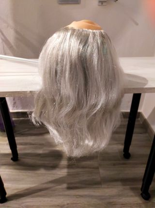 Peluca adulto, cabello gris largo con calva desde la frente y por encima de la cabeza, sin estrenar, en su embalaje original.