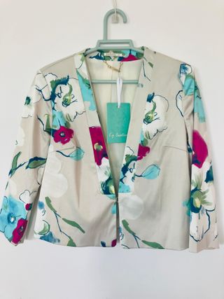 Preciosa chaqueta corta de la marca ZARINA, talla M (36-38). Es de color beige claro y tiene un estampado floral muy bonito y elegante. - Diseño de corte cropped. - Manga tres cuartos. - Cierre delantero con gancho invisible.
