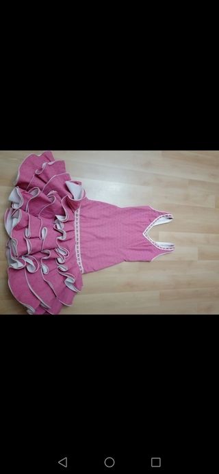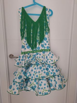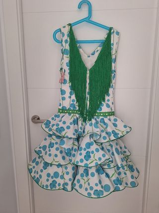 Traje de flamenca con muy poco uso y muy buen estado. Es corto (por la rodilla) y con volantes. Es de la marca de moda flamenca "Maricruz".