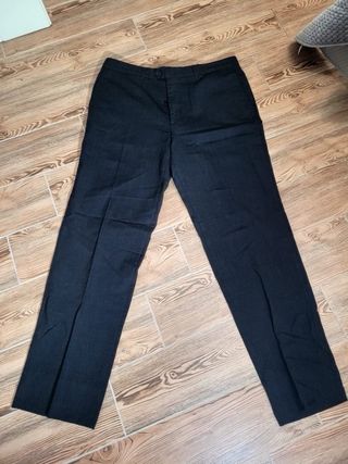 Conjunto de chaqueta talla 48 y pantalón talla 50 de la marca H&M, es de color negro. La chaqueta mide 43cm entre hombros, 51cm entre axilas y 74cm de largo cm de largo y el pantalón mide 44cm de cintura y 109cm de largo. Se ha utilizado muy pocas veces y se vende por falta de uso y espacio