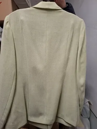 Elegante conjunto de chaqueta y falda en tono verde claro, perfecto para la primavera. - Chaqueta con cierre de dos botones. - Bolsillos frontales con solapa en la chaqueta. - Diseño texturizado en la tela. -Falda estilo lápiz forrada igual que la chaqueta con abertura trasera.