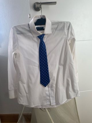 Traje de comunión estilo Almirante de la marca Tizzas - Chaqueta azul marino con detalles en blanco y azul en cuello, puños y hombros. - Corbata azul con estampado. - Escudo bordado en la solapa. - Pantalón azul marino.