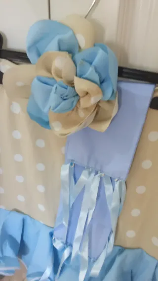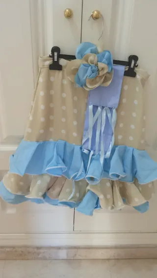Falda flamenca con un diseño alegre y llamativo. - Estampado de lunares blancos sobre fondo beige. - Volantes en color azul claro en el bajo. - Adorno floral y lazo en la cintura. Hecha a mano,la flor la regalo y el fajín. Talla 38