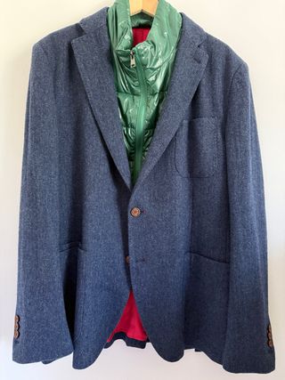 Americana de lana punto de la marca El Ganso. - Color azul con cuello desmontable verde - Cierre de dos botones. - Bolsillos exteriores e interiores - Puños con tres botones.