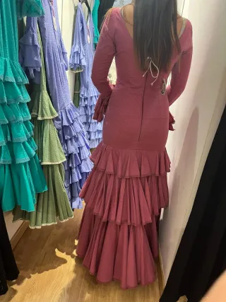 Vestido de flamenca de la marca Micaela Villa. Un diseño elegante y vibrante. - Color rosa intenso. - Volantes en cascada en la falda. - Detalle de volantes en las mangas. Bolsillo interior con cremallera. Tiene para sacarle como muestro en foto Usado una sola feria