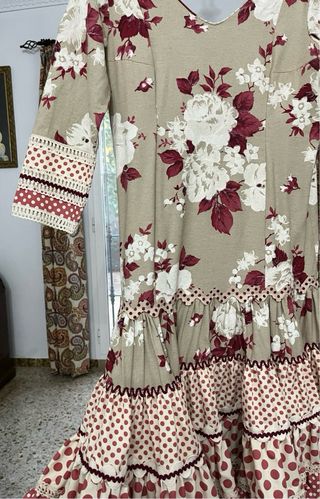 Traje de flamenca con un bonito estampado floral. Diseño exclusivo y único, todo hecho a mano. - Diseño con volantes. - Mangas acampanadas. - Espalda cerrada hasta arriba, con su cremallera. - Con tela sobrante y flor a juego de la misma tela. - Se le puede hechar y cojer.