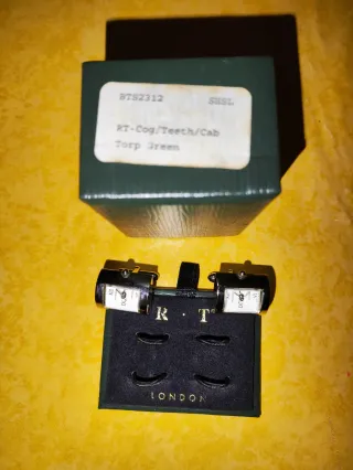Elegantes gemelos–reloj de la marca R.T. London, en perfecto estado y listos para usar. Fabricados en acero inoxidable con mecanismo Japan Movement, ofrecen un diseño clásico y distinguido con números romanos. Incluyen su estuche original “London”, ideal para regalo o colección. Las bisagras funcionan perfectamente y el acabado metálico está muy bien conservado. Medidas estándar de gemelos. Piezas limpias y cuidadas. Listos para entregar. Perfectos para traje, eventos, bodas o como regalo especial. - Detalle de la marca R.T. London.
