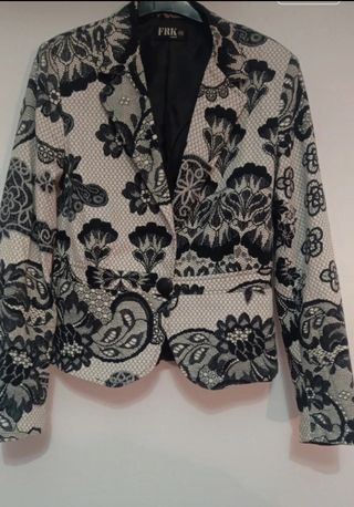 Elegante blazer de la marca FRK. Es una prenda única y llamativa. - Diseño con estampado de encaje en blanco y negro. - Corte entallado. - Cierre de botón.