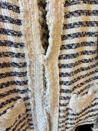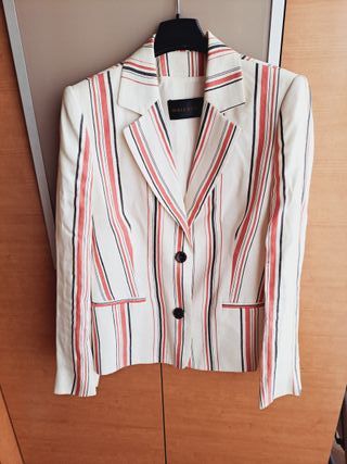 chaqueta/blazer de rayas en azul marino claro con blanco. El diseño es tipo Chanel. 2 bolsillos en los lados, uno con las CH en color plata. es una talla L pero realmente es como una M, yo soy una 36 yme va un poquito grande. ideal para primavera y noches de verano. largo desde arriba 56, manga largo 55 en muy buen estado. tengo muchas chaquetas y vestidos, y no la he puesto mucho. pongo talla M porque es a la que equivale esta chaqueta largo desde arriba: 56 manga: 56 sisa: 41