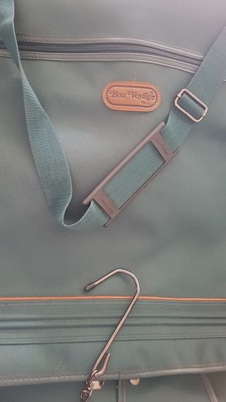 perchero portátil. ideal para que trasporte ropa, trajes, camisas, trajes de noche, vestidos. Unisex. Sin estrenar. Con perchas y varios departamentos para zapatos. Con cremalleras y ganchos para colgar. Asa de mano y cinta para colgarse al hombro. Elegante. Color verde. Se dobla por la mitad para transportarlo cómodamente. Ideal para viajar y llevar la ropa sin arrugar