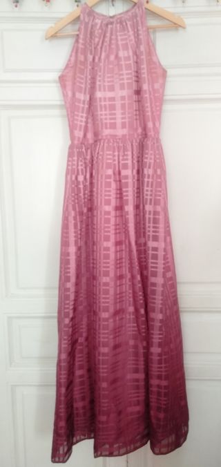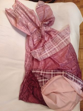 Bonito traje de noche de los años 80. Muy poco uso. De tonos rosa, degradados hasta el bajo, más oscuro. Tiene una banda de la misma tela con unas trabillas muy disimuladas para sujetarla en los costados. Medidas: descritas en la tercera foto.