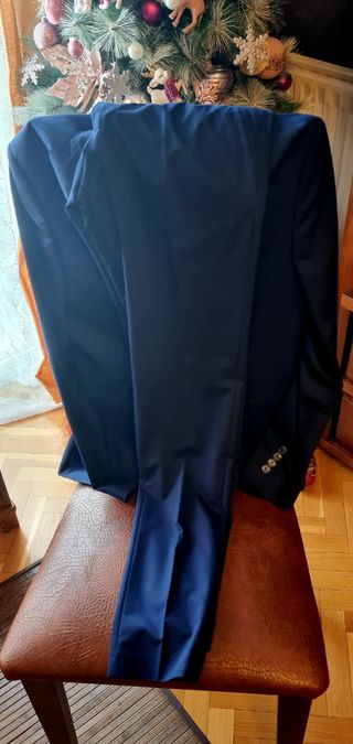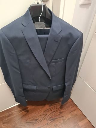 Traje de chaqueta y pantalón marca easy wear del Corte Inglés en color azul noche.La talla de la chaqueta es 52 y la del pantalón 46. Compuesto de 70%lana y 30% viscosa la chaqueta. Y el pantalón lana y polyester. La chaqueta viene forrada tal y como se muestra la foto. Es slim fit(es estrecho). Puesto en 2 ocasiones. Traje de buena calidad.Se puede ver y probar sin compromiso.