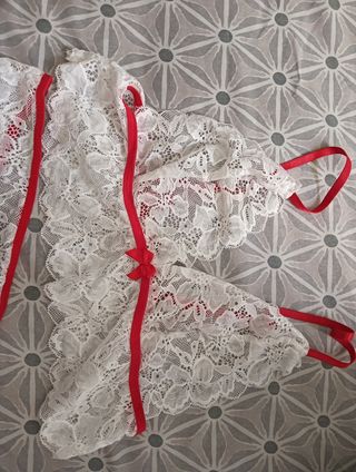 Preciosa lencería de encaje en dos piezas, ideal para una noche especial. - Color rojo y blanco. - Talla única - Diseño elegante y sensual. - Perfecto estado.