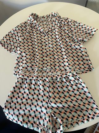 Conjunto de verano con estampado geométrico. La camisa tiene un diseño de cuello clásico y manga corta. El short es a juego con la camisa. Ideal para noches cálidas y cómodas. - Diseño retro con estampado geométrico. - Incluye camisa y short. - Tejido ligero y suave.