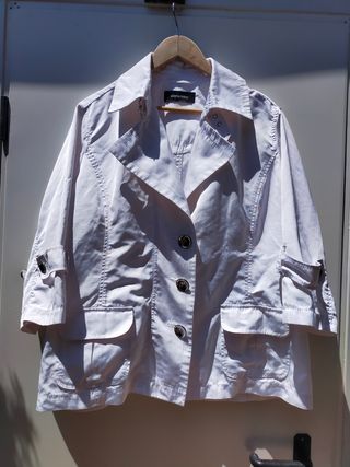 Chaqueta gran calidad blanca diseñadora Elena Miro. Talla grande. Poco uso. Perfecto estado. Ideal noches de verano, primavera, otoño, entretiempo botones metálicos color plata. Manga con 2 botones para adaptar y ajustar al gusto la anchura. Una prenda casual a la par que elegante y. Muy estilosa. Talla 16 USA, equivale a una 46-48 española. Ver medidas exactas en las fotos. Costó 155€.