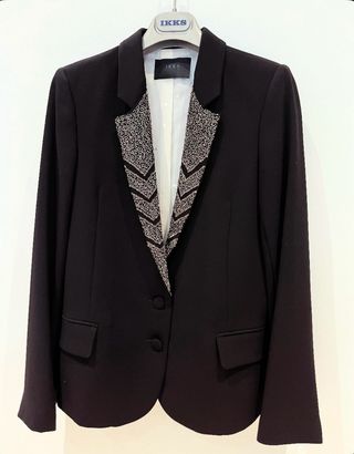 Blazer negra de dos botones, con solapa de pedrería plateada, de la marca Ikks Woman. Ideal para noche o fiesta. Talla 36, utilizada en dos ocasiones. Precio de compra 295€.