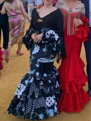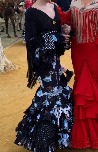 Vestido de flamenca negro con estampado floral,talla 38. Lleva un precioso perforado en la zona del pecho. Diseñadora sevillana Viviana Iorio. Precio negociable.