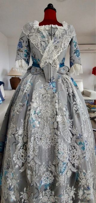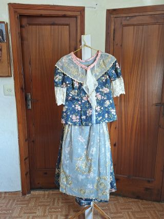 Traje de fallera siglo XIX para niña 8-9-10 años depende de la niña. Color fondo gris perla. Con mangas largas con corchetes invisibles Medidas: cintura falda 63cm pero tiene corchetes para hacerla de 56, 58, 60, 62 tambien. Largo: 86cm y tiene dentro unos 5cm para sacar. (También se le puede meter) Corpiño: de hombro a hombro 26cm Sisa 32cm Largo 42cm Y tiene tela para sacar