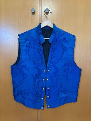 Chaleco para niño con un diseño tradicional fallero. Presenta un estampado floral vibrante sobre fondo azul. Incluye chaleco, camisa, Pantalón, esparteñas y fajín gris - Tejido con motivos florales y cintas. - Ribeteado en color dorado, en muy buen estado, las medidas están en las fotos.