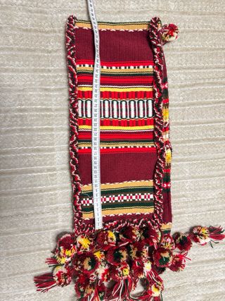 Manta tradicional fallera con un diseño vibrante y llamativo. Perfecta para eventos o como pieza decorativa. - Diseño de rayas multicolor. - Adornada con flecos y pompones en los extremos.
