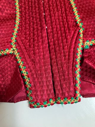 Corpiño de fallera infantil de color rojo, con un diseño de rombos y detalles de pasamanería. - Tejido con relieve de rombos. - Adornado con pasamanería dorada y verde. - Escote cuadrado. - Mangas largas . dependiendo niña adjunto medidas sisa 35, hombros 29, manga 43, largo 42 3 cm delantero 3cm espalda para sacar total 6 regalo tela bastante
