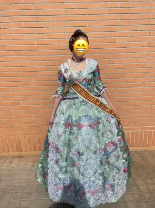 Traje de fallera con un diseño floral vibrante y detalles de encaje. Precio negociable. Usado 2 veces.
