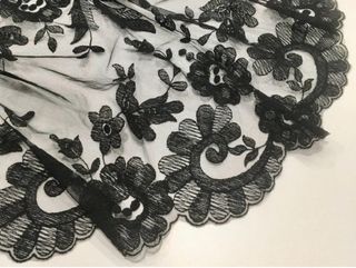 Mantilla fallera nueva, sin estrenar de diseño de media luna. Perfecta para complementar tu traje regional. - Tul bordado negro. - Borde festoneado. - Diseño floral detallado. Medidas: 150 cm de ancho x 80 cm de caída.