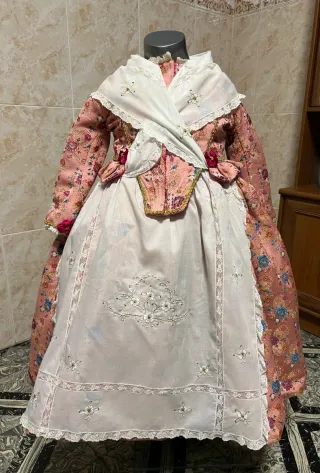 Traje de fallera con un diseño floral muy detallado. - Tejido principal en tono rosa con estampado floral. - Delantal blanco con bordados florales. - Cuello y puños con encaje y detalles. - Adornos en dorado y fucsia. Precio negociable.
