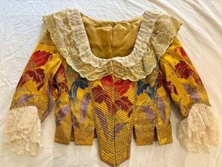 Conjunto de corpiño y tela 2 m2 para traje de fallera con un diseño vibrante. - Tejido con estampado floral y damasco. - Detalles en hilo dorado. - Mangas con encaje blanco. - Parte inferior de la falda visible.