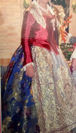 Traje de fallera con un diseño floral vibrante sobre fondo azul. Incluye cintas rojas para anudar. - Tejido brocado con motivos florales. - Detalle de cintas rojas satinadas. Los zapatos talla 36. Todo como nuevo. Usado dos años.