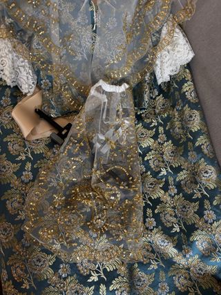 Traje de fallera de época, inspirado en el siglo XVIII. Un diseño elegante y detallado. - Tejido principal en color azul verdoso. - Adornos y detalles Incluye corpiño de manga larga, manteletas,peinetas y zapatos.