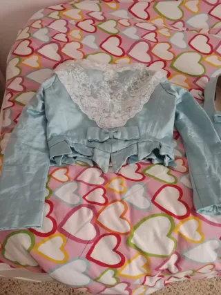 Conjunto de traje de fallera con un diseño vibrante y detallado. - Tejido principal con estampado floral en tonos rojos y azules. - Mangas con encaje blanco y detalles de puntilla. - Cuello adornado con encaje y detalles dorados. - Ribete azul en los bordes del corpiño y las mangas. -Tres pares de zapatos de talla 32,34 y 35. PRECIO ALGO NEGOCIABLE.