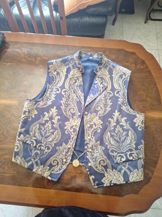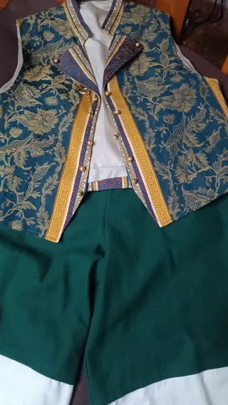 -Conjunto de chaleco y pantalón estilo fallero Saragüell./// 80€ -Calcetines , medias fallero 44-46 ///. 12€ por pareja -Ligueros fallero ////. 10€ -Fajín fallero////. 8€ - Chaleco con estampado floral en tonos verdes y azules. - Ribetes dorados y detalles de pedrería en el chaleco. - Pantalón de color verde liso. - Cinturón a juego con el chaleco.