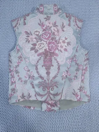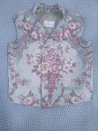 Chaleco / Xupetí fallero tanto saragüell como torrentí para niño, ideal para fiestas falleras en Valencia y Castellón. - Diseño con estampado floral en tonos pastel. - Cierre cruzado con botones. - Cuello solapa. - Hecho a mano por la empresa Vicemar - COMPLETAMENTE NUEVO, sin marcas de uso. - Color fondo verde-azulado, detalles blanco, rosa y marrón. - Precioso