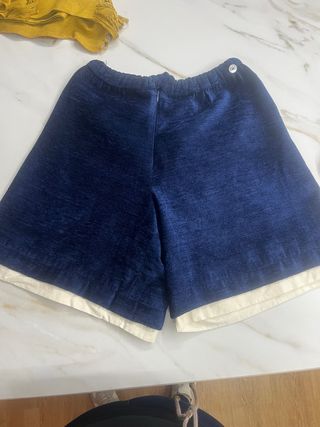 Pantalón tipo saragüell para niño, con un diseño de doble capa. - Capa exterior en tejido azul, tipo terciopelo - Capa interior en tejido blanco - Cintura elástica con detalle de botón.