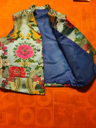 Chaleco de estilo fallero o saraguell, con un diseño muy elaborado y colorido. - Tejido principal en tono azul claro. - Bordados florales en tonos fucsia, amarillo, rojo y verde. - Detalle de pasamanería dorada en los bordados. - Cierre con botones forrados a tono. Medidas en la foto.. para nene de aprox 11/13