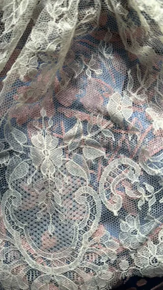 Traje de fallera con un diseño floral intrincado. - Tejido de encaje blanco sobre fondo azul. - Detalle de flores en tonos rosas y blancos.