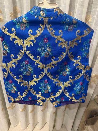 Elegante chaleco con un diseño tradicional fallero. Presenta un intrincado brocado floral. - Tejido principal azul con detalles dorados. - Motivos florales en rojo, rosa, azul y morado. - Cierre de botones. - Adornos colgantes dorados.