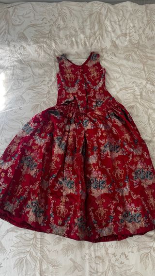 Traje de fallera infantil con un diseño floral muy detallado. - Tejido principal en color rojo. - Adornos dorados y azules. - Diseño tradicional. •Medidas• Largo falda: 80cm Cintura falda: 60 cm