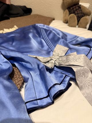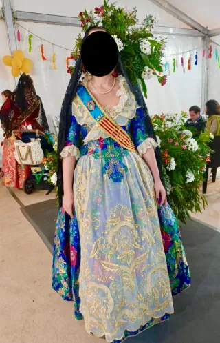 Traje tradicional de Fallera, completo con manteletas. - Diseño floral vibrante sobre fondo azul. - Manteletas delicadas con detalles dorados. - Cuello adornado con encaje. Largo 92 cm. Desde la cintura Cinturilla 4 cm. Sisa 36 cm Escote hasta la pana 31 cm Espalda 36 cm También tengo cancan con hombreras(eso a parte) de La Llar del fil de 80