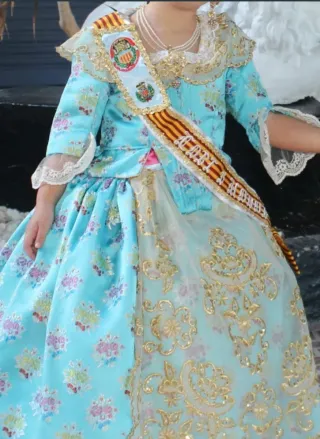 Traje de fallera para niña, ideal para fiestas y celebraciones. - Diseño con detalles florales. - Tejido blanco y azul con adornos dorados. - Incluye varias piezas para un conjunto completo.