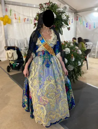 Traje de fallera para alquilar, una pieza única para eventos especiales. - Diseño intrincado con detalles dorados. - Tejido principal en tonos azules vibrantes.