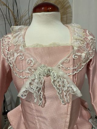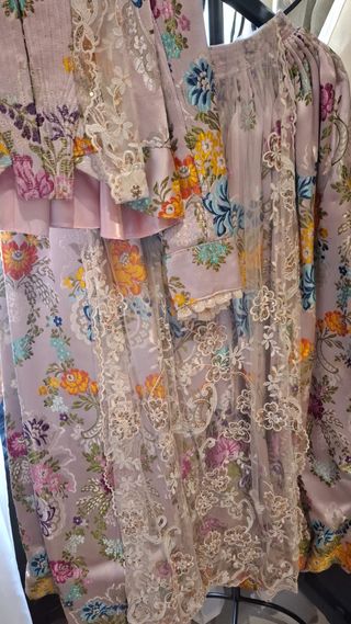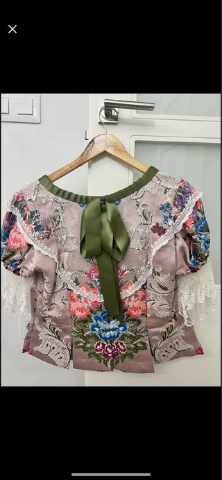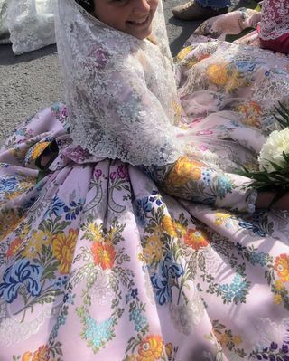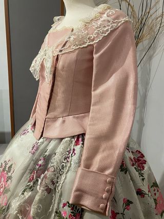 Traje de fallera con un diseño floral y encaje. - Tejido principal con estampado floral. - Detalles de encaje blanco. - Mangas largas con puñoy encaje. - Cuello adornado con encaje. - Solo puesto una vez. - artesanal