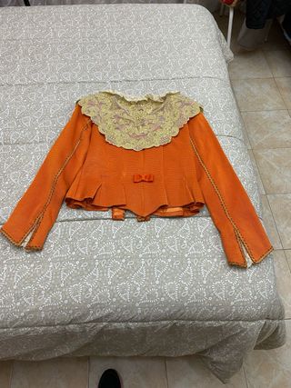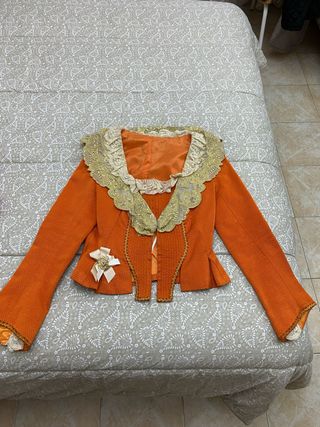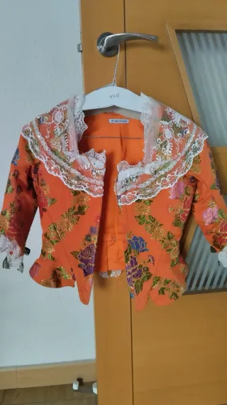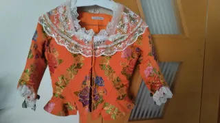 Traje de fallera con un diseño vibrante y detallado. - Tejido principal en color naranja. - Adornado con bordados florales en múltiples colores. - Cuello y puños con encaje blanco. Es para una niña a partir de 11 años. La falda tiene 98cm de largo. Está toda sacada, ya no queda más tela para sacar ni en falda ni en corpiño