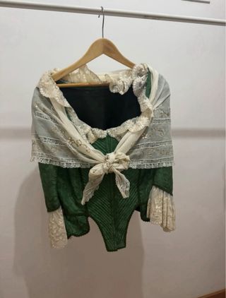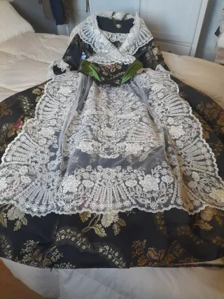 Traje tradicional de huertana / fallera - Diseño con falda larga y blusa. - Delicado encaje en la mantilla. - Adornos bordados en la parte delantera. Se vende traje con manteletas. Medidas Corpiño: -Contorno de pecho 88cm -Largo 45cm -Contorno cintura 72cm -Largo manga 34cm -Contorno brazo 30cm Medidas falda: -Cintura 70cm -Largo 90cm