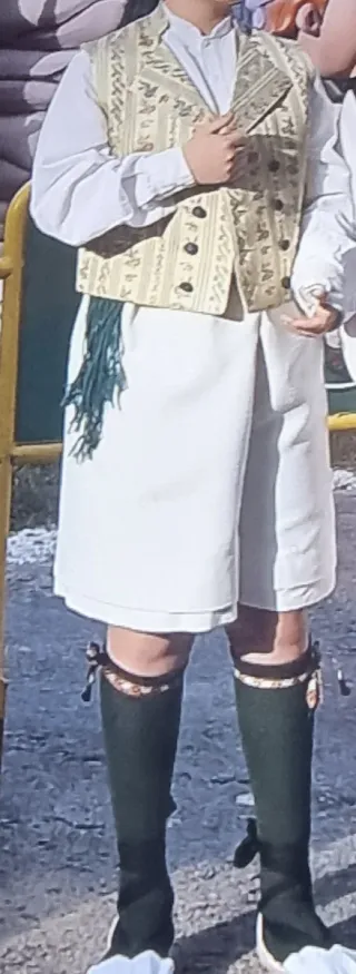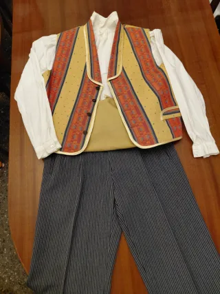 Traje regional de saragüell/fallero con un diseño tradicional y elegante. - Chaleco gris plata com motivos florales, talla 56 (16-18 años). - Camisa blanca talla 18. - Pantalón blanco talla 46 - alpargatas/ espardenyes “Catalinetes” talla 39, muy cómodas. - Fajín negro - Calcetines calados grises talla 39 Regalo Lligacames. No incluye manta morellana ni collar. Precio no negociable.