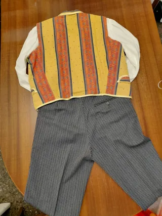 Conjunto de traje de fallero para niño. - Chaleco con diseño de rayas verticales y detalles. Talla 48. Medidas en las fotos - Camisa blanca de manga larga. Talla 37 - Pantalón de rayas finas. Talla 40 - Faja de color dorado