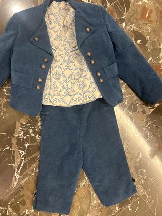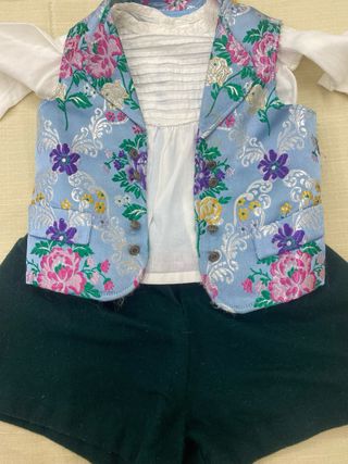 Conjunto de traje fallero para niño con un diseño elegante. Talla 4 aprox Traje torrentí. - Chaqueta azul con detalles de botones plateados. - Chaleco interior con estampado floral en tonos azul y blanco. - Bolsillo en la parte delantera de la chaqueta. Medidas Chaqueta: - Entre hombros 28cm - largo manga 36cm - largo chaquetilla delante desde hombro 36cm Pantalon - largo 39cm - ancho cintura 23cm (ajustable) Chaleco - ancho hombros 22,5cm - largo delantero 31 cm *Medidas aproximadas