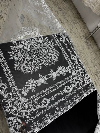 Elegante mantilla de fallera en color blanco, confeccionada con delicado encaje. - Diseño floral. - Adorno de festón en el borde. 2 metros de largox93 de ancho